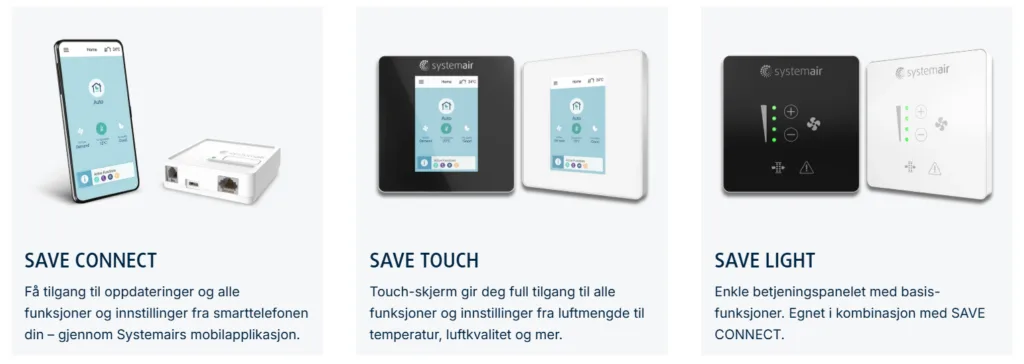 • SAVE TOUCH –  Betjeningspanel med berøringsskjerm og full tilgang til alle funksjoner. Startskjermen viser informasjon som luftmengde, temperatur, luftkvalitet og aktive funksjoner. Du kan velge mellom MANUELL og AUTO-modus eller velge foretrukne innstillinger fra de forhåndskonfigurerte brukermodusene. Tilgjengelig brukernivå for installatører/servicepersonell (SUW – Start Up Wizard).